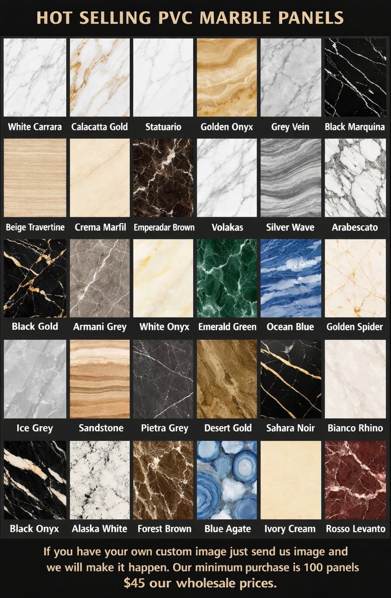 PVC Marble Sheet is a high end pvc panels which gives a sophisticated and simple look to interior. It is suitable for most building applications for fitting in walls, bathroom. ceilings, TV Accent wall, Damped wall Control, banquet hall. Any residential or commercial interior designs.